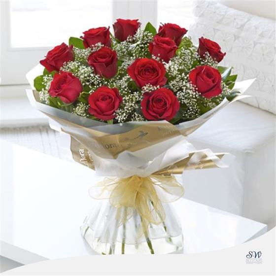 Elevate your gesture with this exquisite arrangement showcasing 12 Large-Headed Red Roses hand-tied with Gypsophila and Salal leaves, elegantly finished with gift wrapping and ribbon. At SW Blooms, we take pride in ensuring you receive only the finest selection of Large-Headed Red Roses.