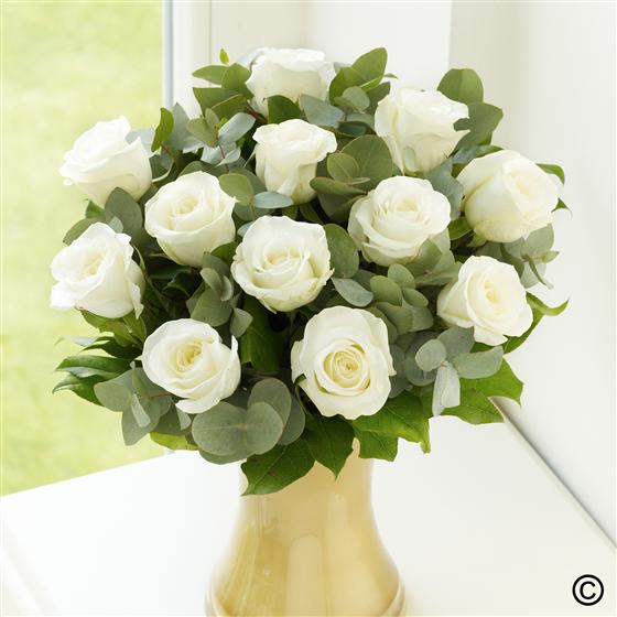 12 Long stemmed 60-70cm White Roses in gift wrapping.