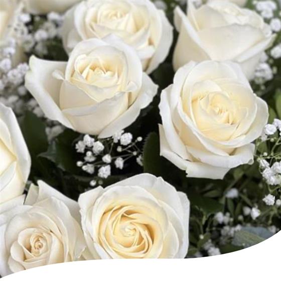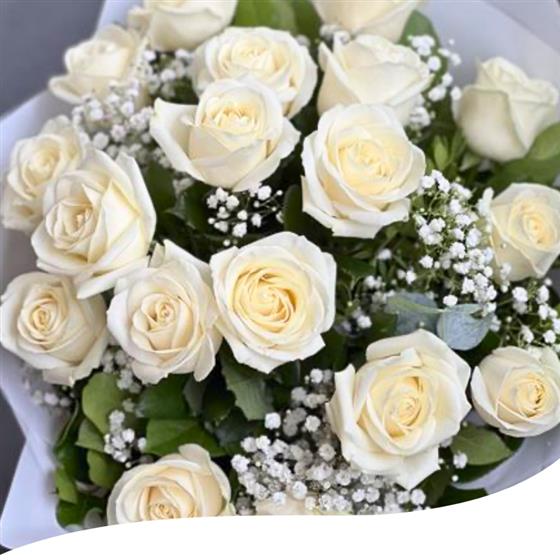 18 White Avalanche or Mondial Roses, gyp and mixed foliage make this a simply stunning bouquet.