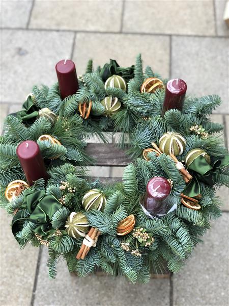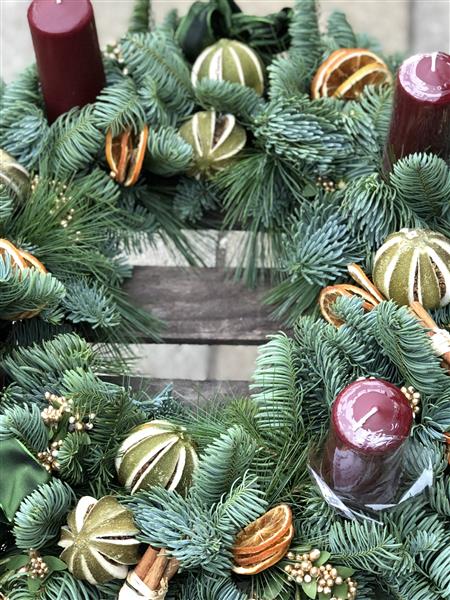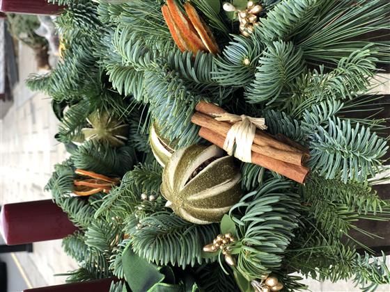 We used mixed pines and decorated the wreath with dried fruits such as limes and oranges. Cinnamon twigs with pine cones and Beautiful ribbon bows.