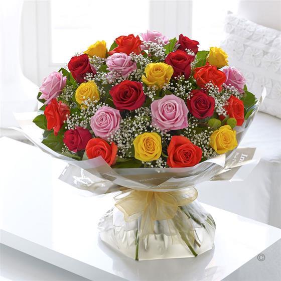 Two dozen mixed roses arranged into a handtied display with gyp and foliage, featuring 6 Fresh Naranga Orange Roses, 6 Yellow Tara Roses, 6 Pink Aqua Roses and 6 Red Grand Prix or Freedom Roses will be used.