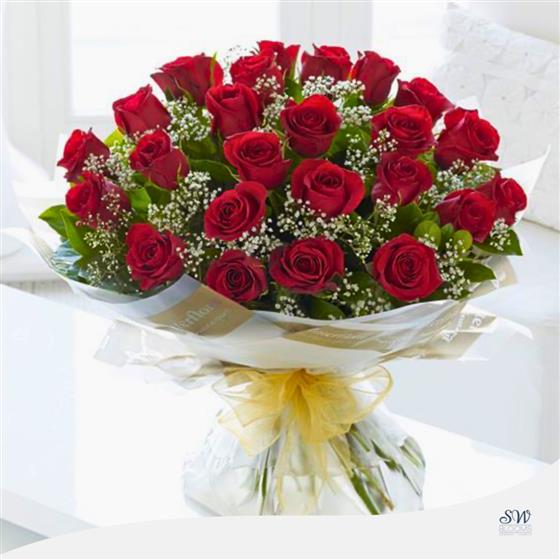 Elevate your gesture with this exquisite arrangement showcasing 24 Large-Headed Red Roses hand-tied with Gypsophila and Salal leaves, elegantly finished with gift wrapping and ribbon. At SW Blooms, we take pride in ensuring you receive only the finest selection of Large-Headed Red Roses.