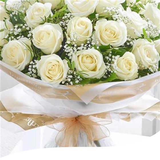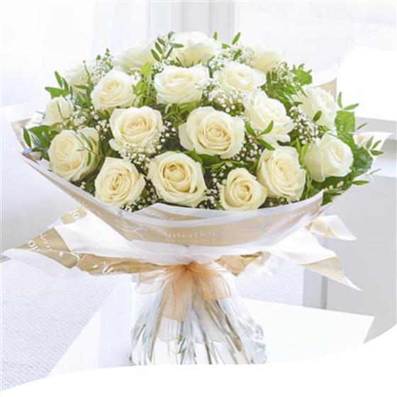 Presenting our 24 White Rose With Gypsophila — a stunning hand-tied of purity and grace. This exquisite bouquet features 24 Large-Headed White Roses expertly hand-tied with Gypsophila and Salal leaves, elegantly adorned with gift wrap and ribbon, ensuring an unforgettable and breathtaking floral gesture.