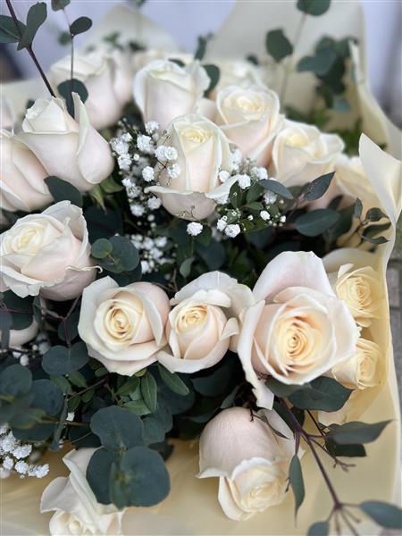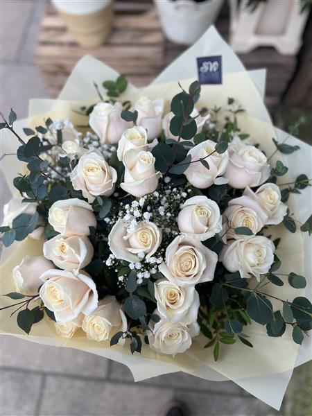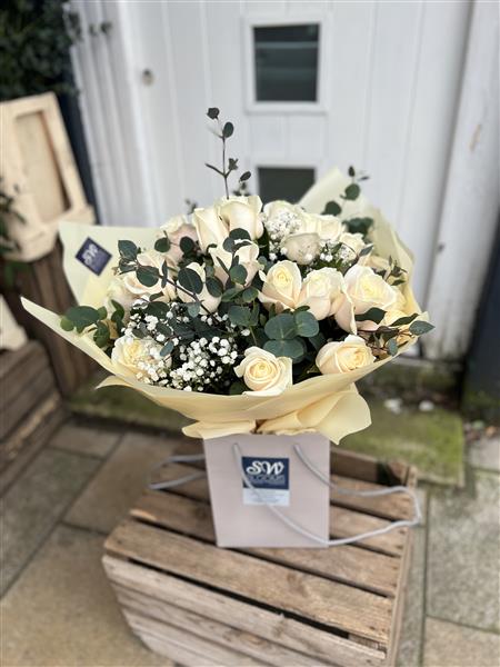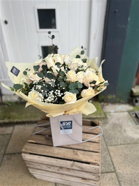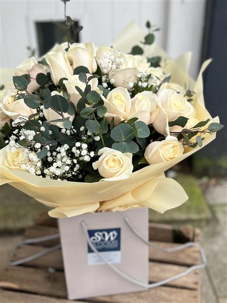 Hand tied with fresh Eucalyptus, White Gypsophila and a mixture of foliage 30 Dorchester Roses fresh and ready to bloom. Award winning Dutch Roses and a firm favourite here at SW Blooms.