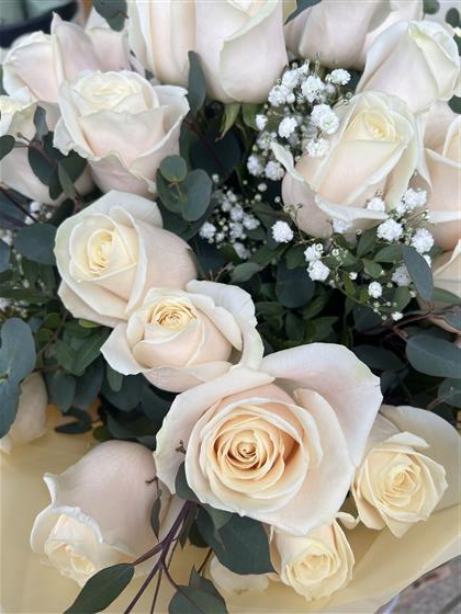 30 Classy Champagne Dorchester Roses with foliage and gypsophila.