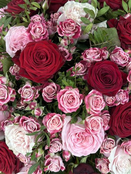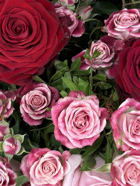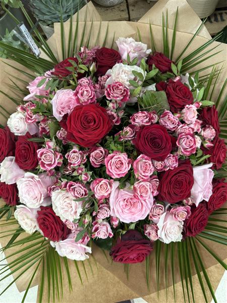 16 Red Naomi Roses, 12 perfumed Pale Pink O’Hara Roses, 10 Cerise Spray Roses and 12 Pale Pink Mondial Roses.