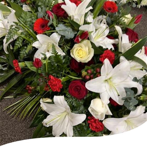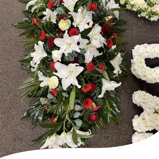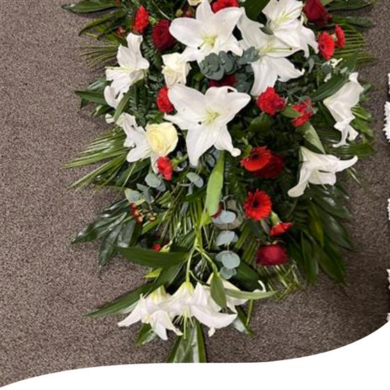 A 6 foot long, red and white mixed flower coffin spray. Made with beautiful open white lilies, red roses, white roses, red tulips, red Gerberas, mixed foliage including eucalyptus and palm leaves.