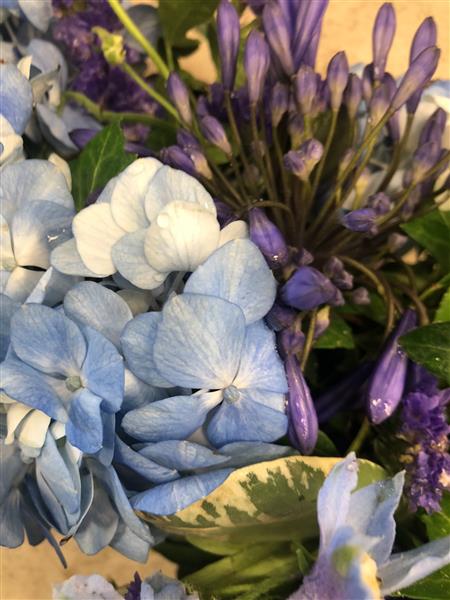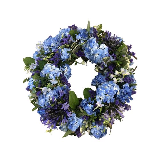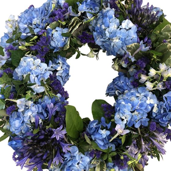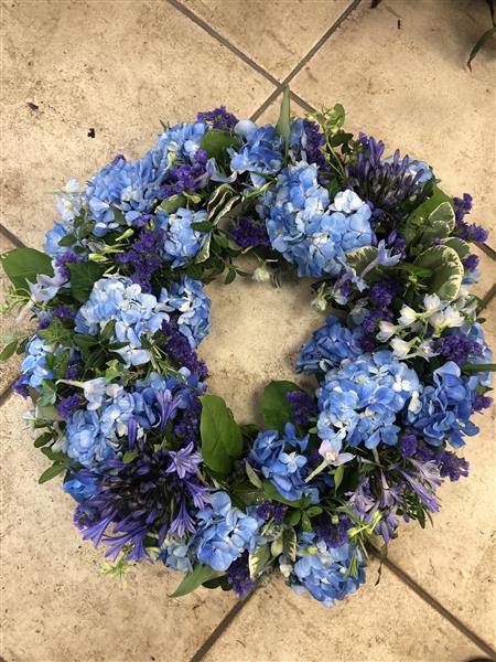 A Wreath in different shades of blue using seasonal flowers. Flowers could include nay of the following: Hydrangeas, Roses, Agapanthus, Veronicas, Delphiniums, Hyacinths, Gentian,