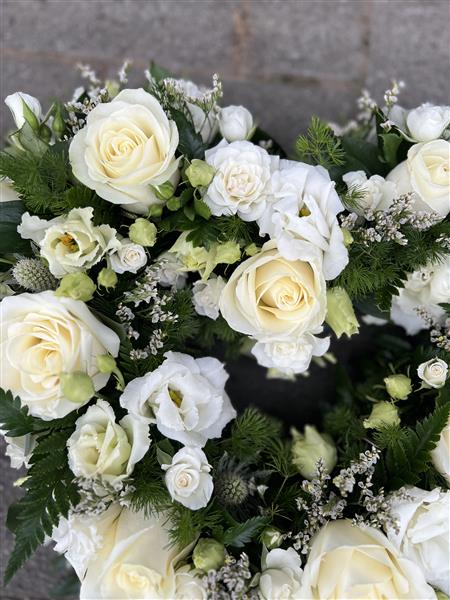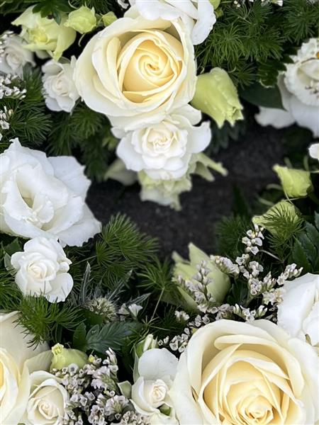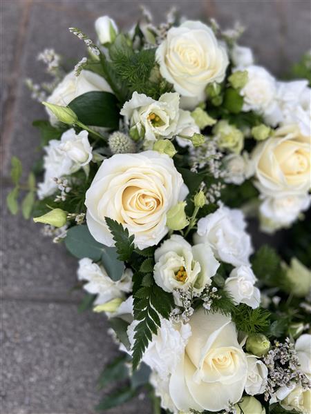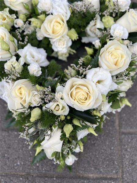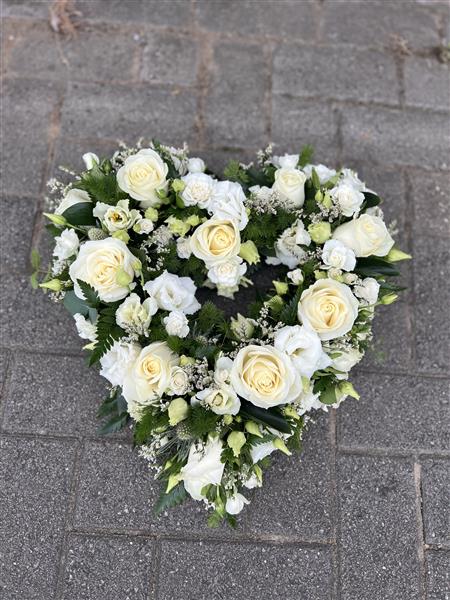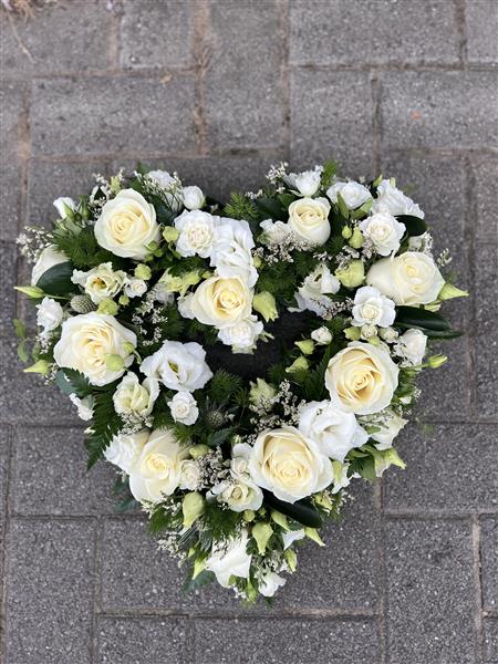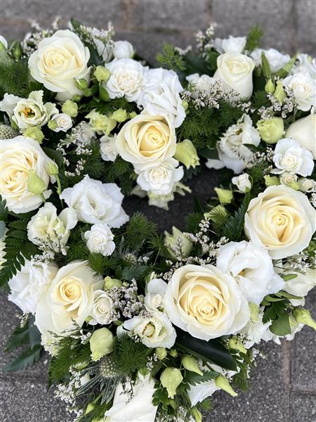 An all White Open Heart with White roses and Soray roses. Mixed flowers such as Eryngium Thistles, Limonium fillers, Lisianthus and Hydrangeas.
