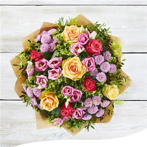 Experience the elegance of our Apricot Rose Bouquet, a stunning hand-tied arrangement featuring a beautiful mix of cerise and peach roses, pink lisianthus, and a selection of summer filler flowers. This bouquet arrives gift-wrapped and is expertly arranged in water to ensure freshness.