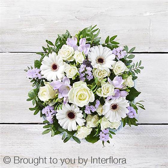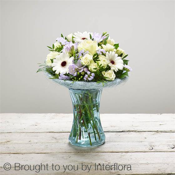 Featuring white large headed roses, white germini, white spray roses and purple freesia with lilac statice, salal and pistache, in a blue curved glass vase with light blue sisal collar.
