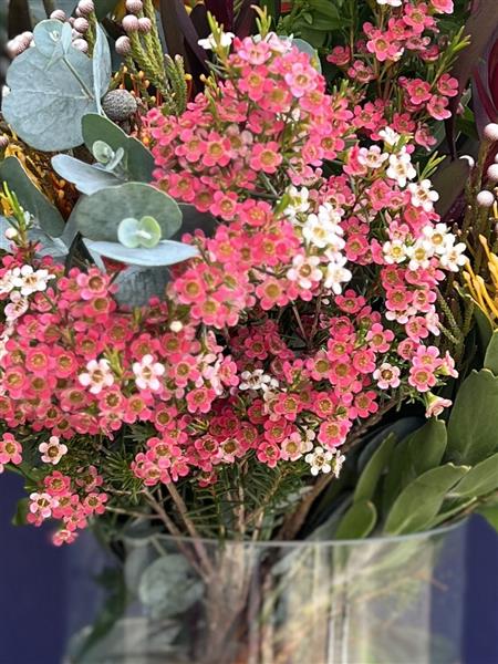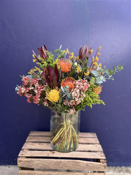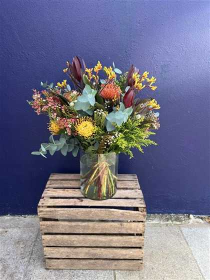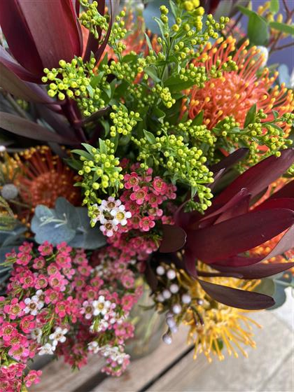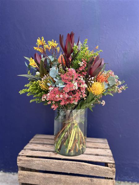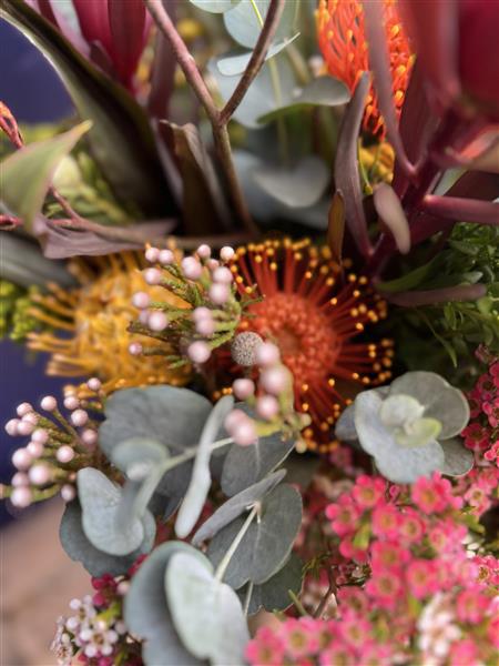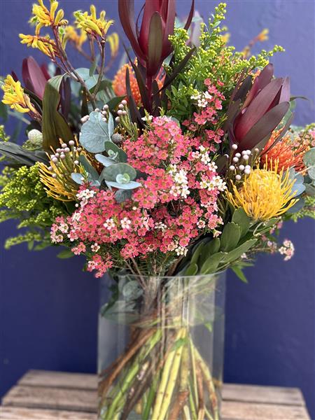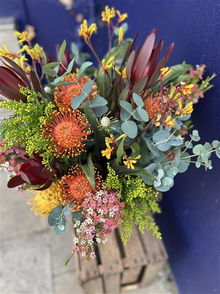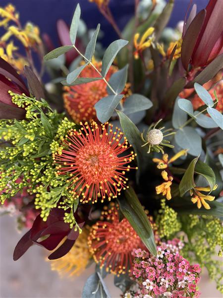 Using both beautiful Kangaroo Paws in reds and golds. Both Orange and Yellow Pin Cushion Leucospurnums, Red Leucodendruns, Golden Rod Soli, Grey Brunia, stunning wax flowers, Mixed Eucalyptus foliage into a designer Cylinder vase. Our Australia flower bouquet in vase is a top seller rand available throughout the UK.