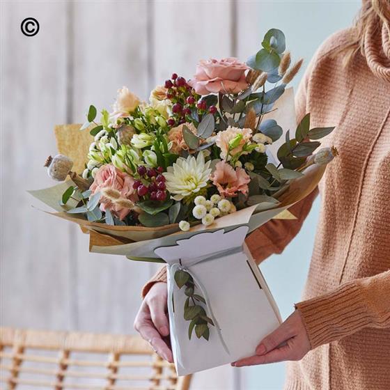 A mix of Autumn blooms and foliage. Crafted in a fresh, modern style and tucked in a sleek gift box.