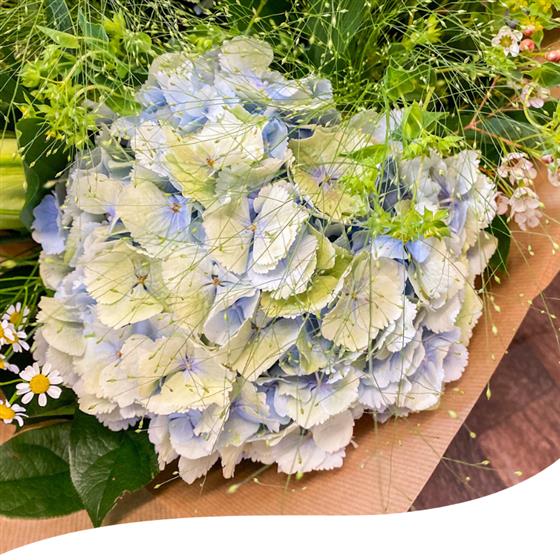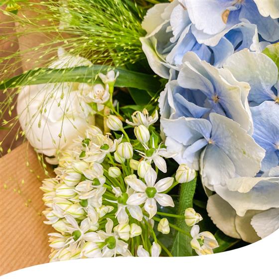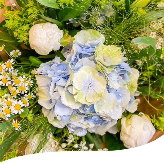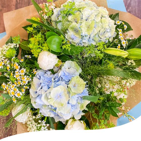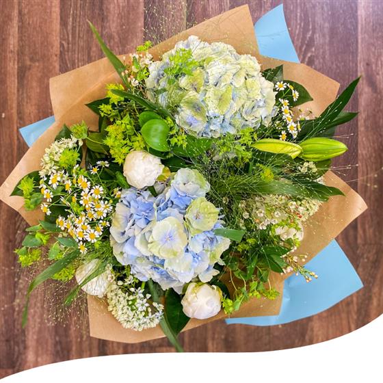 Meet our Azure Breeze Summer Bouquet, a gorgeous hand-tied arrangement featuring a soothing mix of pastel blue Hydrangeas, delicate white Peonies, Daisies and white Lilies, and elegantly combined with lush greenery.