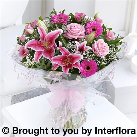Featuring cerise germini, pink Oriental lily, pink lisianthus and pink large headed roses hand-tied with gypsophila, aspidistra leaves, eucalyptus and salal, gift-wrapped and trimmed with pink organza ribbon.