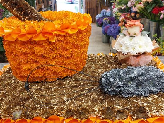 We made a mixing bowl, wooden spoon, cupcake and a whisk out of flowers sitting onto a nice base.