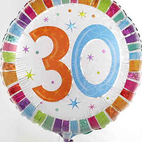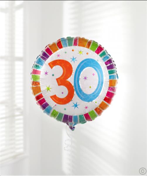 This colourful 30th birthday balloon has a brightly coloured stripes and spots design and a big ’30!’ motif on the front. The micro-foil balloon is a 48cm square pillow shape and arrives filled with helium and tied to a weight with curling ribbon.