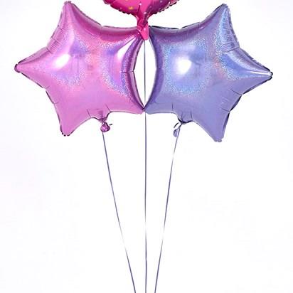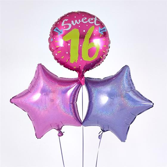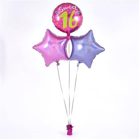 This eye-catching 16th Birthday balloon bouquet is radiant with an array of Pink and Lilac metallic colours – just right for a 16th Birthday. The Star and Circular 45cm micro-foil balloons arrive filled with helium and tied to a weight with curling ribbon decorations.
