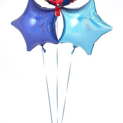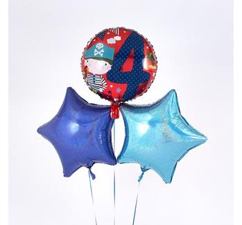 This eye-catching 4th Birthday balloon bouquet is radiant with an array of Blue metallic colours – just right for a 4th Birthday. The Star and Circular 45cm micro-foil balloons arrive filled with helium and tied to a weight with curling ribbon decorations.