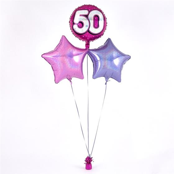 This eye-catching 50th Birthday balloon bouquet is radiant with an array of Pink and Lilac metallic colours – just right for a 50th Birthday. The Star and Circular 45cm micro-foil balloons arrive filled with helium and tied to a weight with curling ribbon decorations.