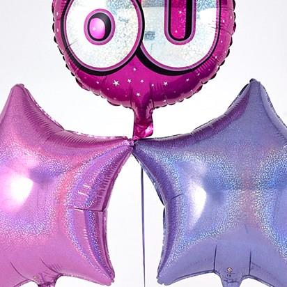 This eye-catching 60th Birthday balloon bouquet is radiant with an array of Pink and Lilac metallic colours – just right for a 60th Birthday. The Star and Circular 45cm micro-foil balloons arrive filled with helium and tied to a weight with curling ribbon decorations.