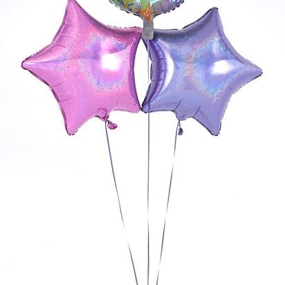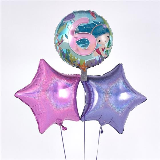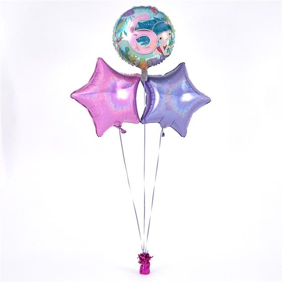 This eye-catching 6th Birthday balloon bouquet is radiant with an array of Pink and Lilac metallic colours – just right for a 6th Birthday. The Star and Circular 45cm micro-foil balloons arrive filled with helium and tied to a weight with curling ribbon decorations.