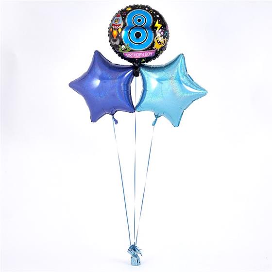 This eye-catching 8th Birthday balloon bouquet is radiant with an array of Blue metallic colours – just right for a Childs 8th Birthday. The Star and Circular 45cm micro-foil balloons arrive filled with helium and tied to a weight with curling ribbon decorations.