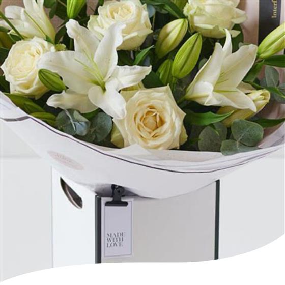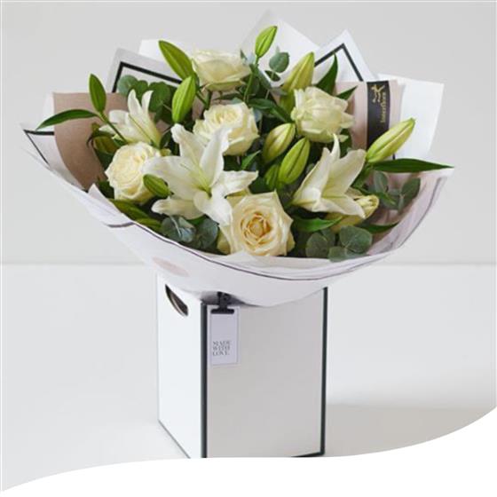 This bouquet combines Pure White Roses and Lilies to create a stunning aesthetic. The Large and Full Roses, along with the Tall and Slender Lilies, exude Sophistication and Grace, making it perfect for any occasion.