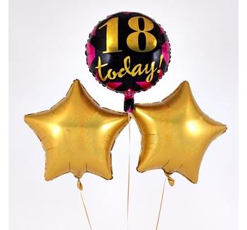 This eye-catching 18th Birthday balloon bouquet is radiant with an array of Gold metallic colours – just right for getting into the party mood. The Circular and Star 45cm micro-foil balloons arrive filled with helium and tied to a weight with curling ribbon decorations.