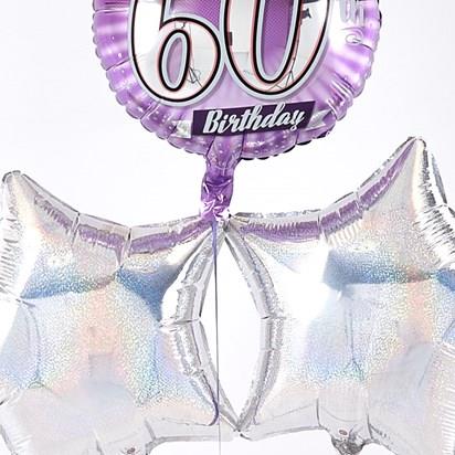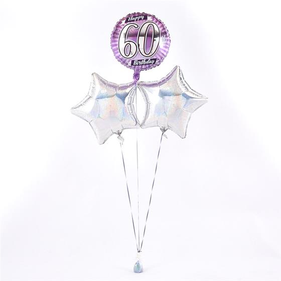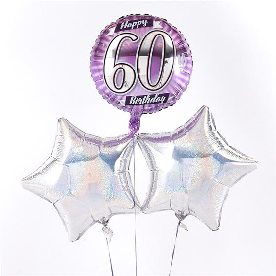 This eye-catching 60th Birthday balloon bouquet is radiant with an array of Silver and Lilac metallic colours – just right for a 60th Birthday. The Star and Circular 45cm micro-foil balloons arrive filled with helium and tied to a weight with curling ribbon decorations.