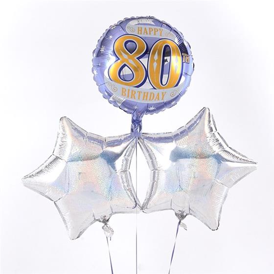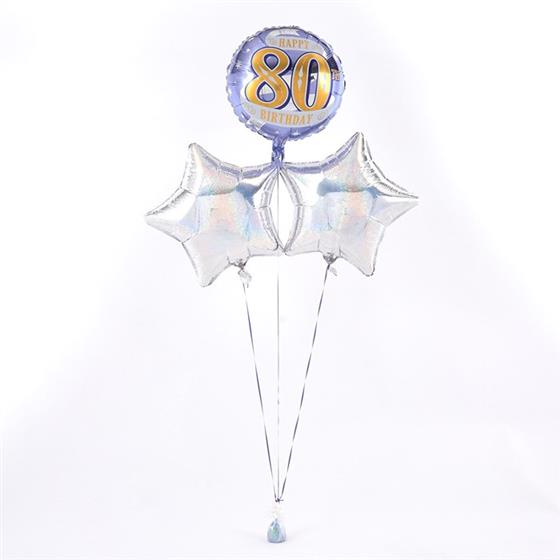 This eye-catching 80th Birthday balloon bouquet is radiant with an array of Silver and Lilac metallic colours – just right for an 80th Birthday. The Star and Circular 45cm micro-foil balloons arrive filled with helium and tied to a weight with curling ribbon decorations.