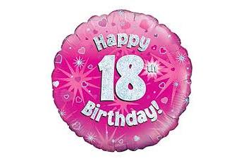 This eye-catching 18th Birthday balloon is radiant with an array of Pink metallic colours and silver sparkles – just right for getting into the party mood. The circular 45cm micro-foil balloon arrives filled with helium and tied to a weight with curling ribbon.