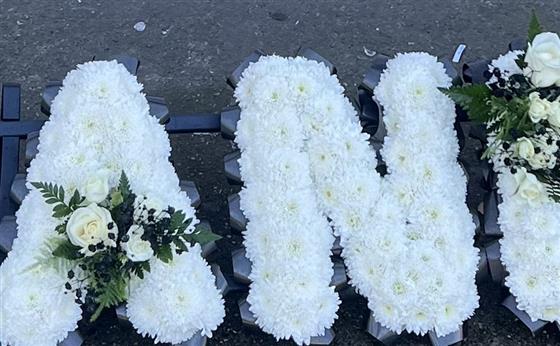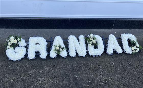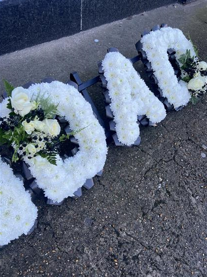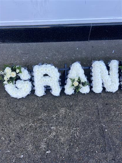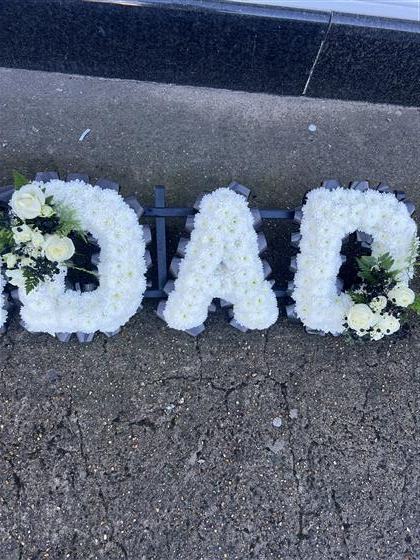 We used black ribbon edge and white Chrysanthemums. 4 flower sprays using white lisianthus and white avalanche roses with black gypsophila.