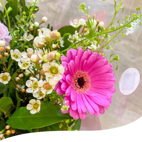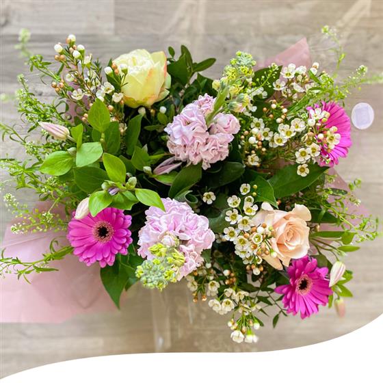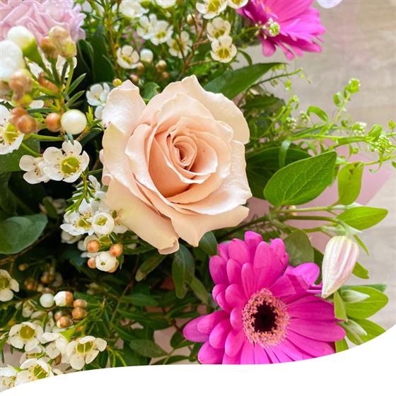 Brighten any space with our Blossom Harmony Bouquet. This stunning arrangement features vibrant Gerbera Daisies, delicate Peach and Yellow Roses, charming Wax Flowers and lush Stocks, creating a beautiful blend of colours and textures.