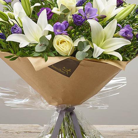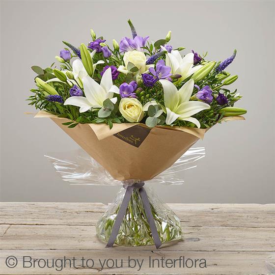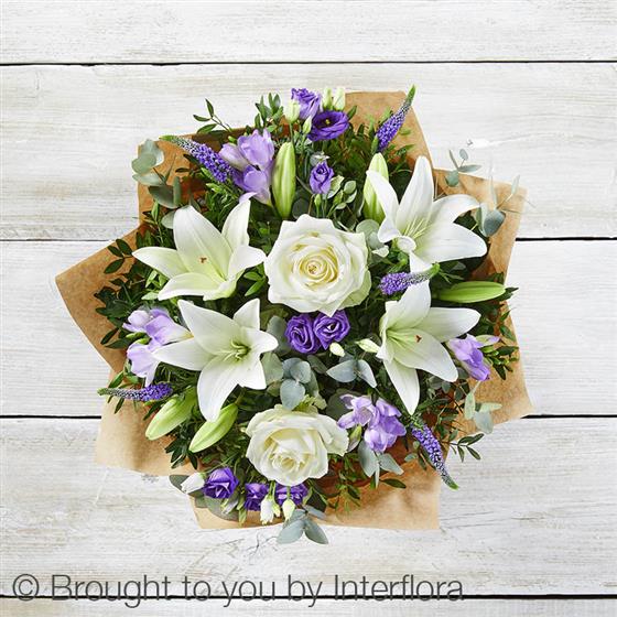 Featuring white LA lily, ivory large headed rose, purple freesia, blue veronica, purple lisianthus, eucalyptus & pistache, presented in gift packaging.