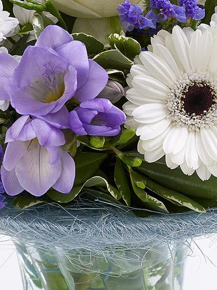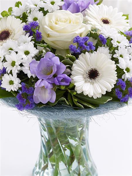 Shades of pastel blue and lilac are perfect, here we’ve contrasted them with fresh white for ultimate impact on arrival. Featuring 3 white germini, a white large headed rose, 3 white spray chrysanthemums and 2 purple freesia, with purple statice, salal and pittosporum, arranged in a clear glass vase slightly different to the one pictured. The blue vase is discontinued.