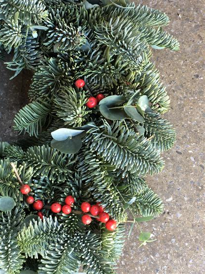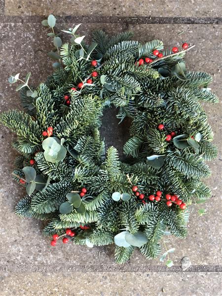 Blue Pine door Wreath with mixed Eucalyptus and Red Ilex Berries.