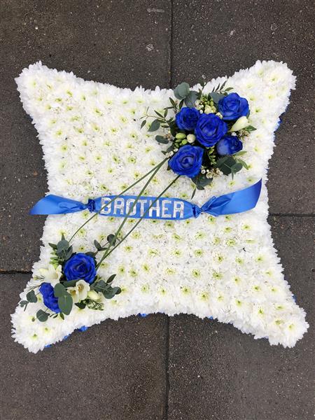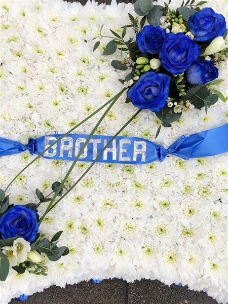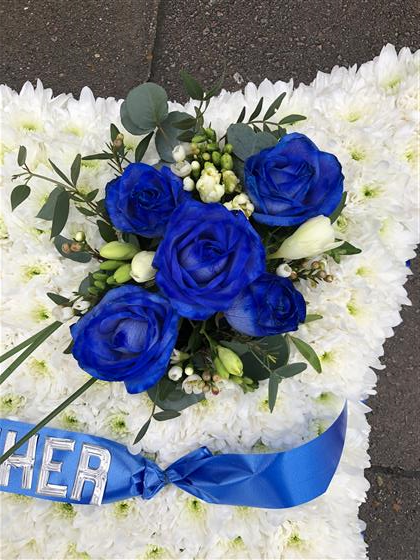 White Chrysanthemum base with a blue rose and White Freesia sprays.