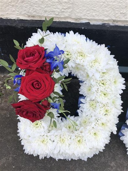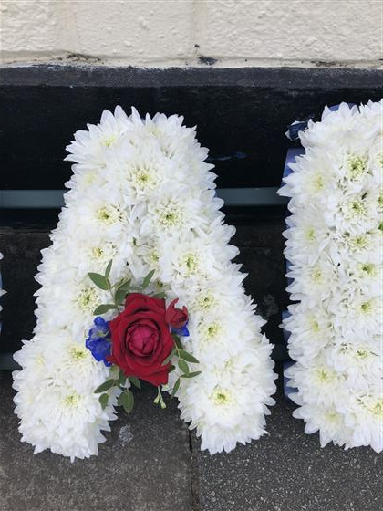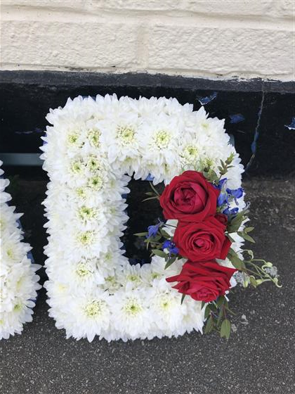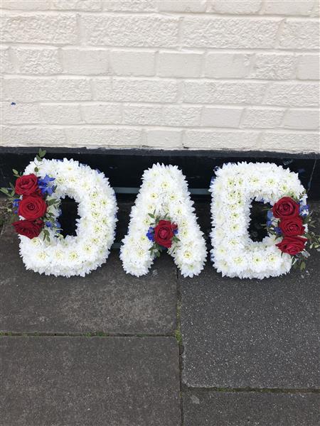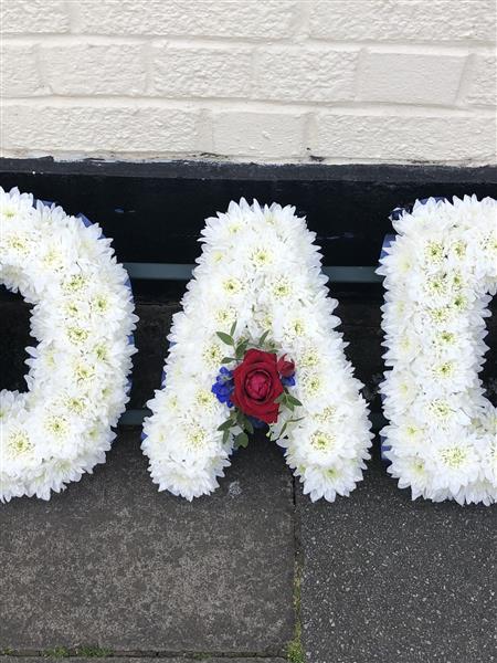 A Blue and White Flower Dad Tribute. White Chrysanthemums, Red Roses, Blue Delphiniums