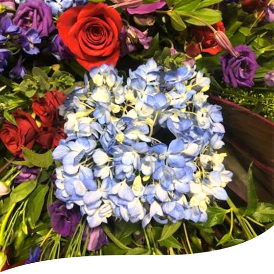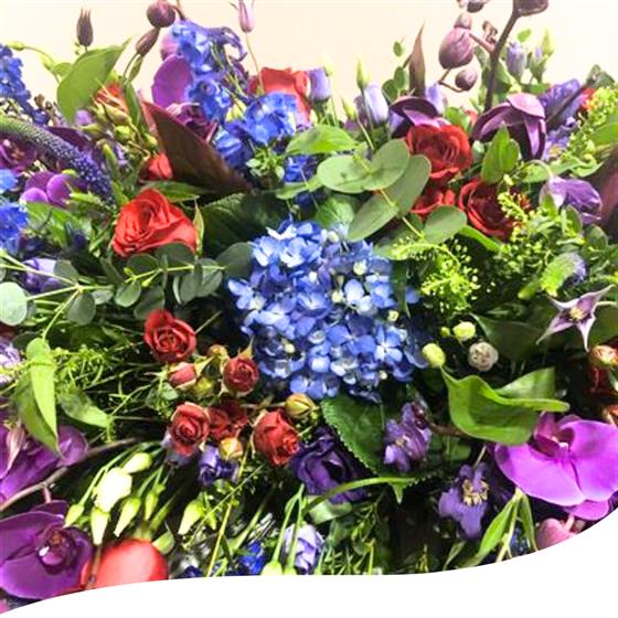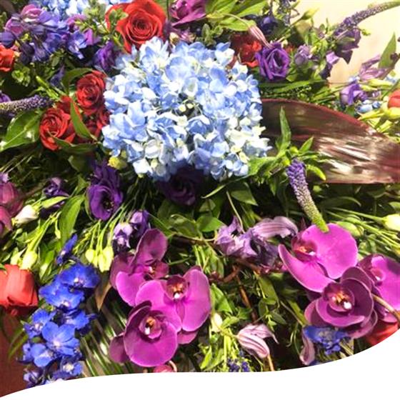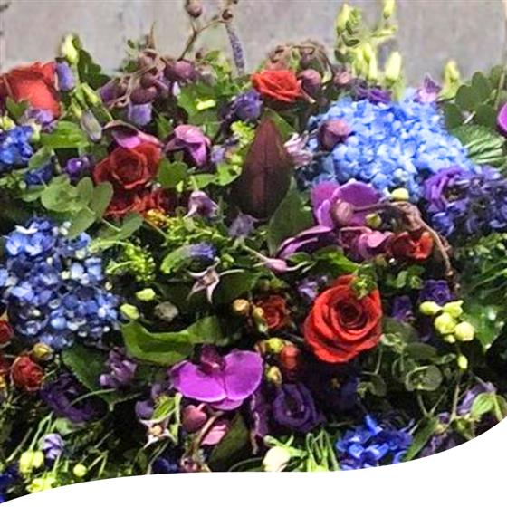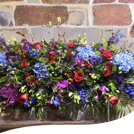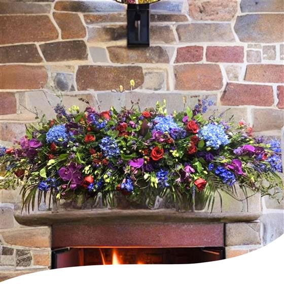 A 6 foot long and full fireplace arrangement using Blue Hydrangeas, Red Naomi Roses, Purple Orchids, Red Spray Roses, Purple Lisianthus, Red Dracena Leaves, Thlaspi foliage, Purple Veronicas, Blue Delphinium and a mix of eucalyptus foliage.