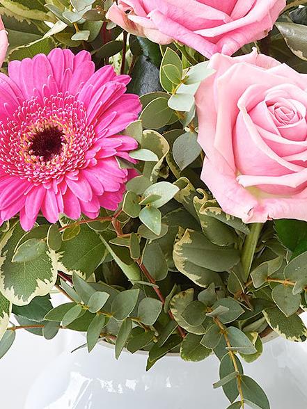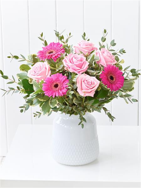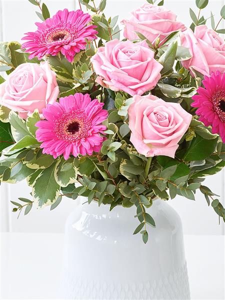 Featuring pink large headed roses and cerise germini, arranged with pittosporum and eucalyptus in a white glass vase.