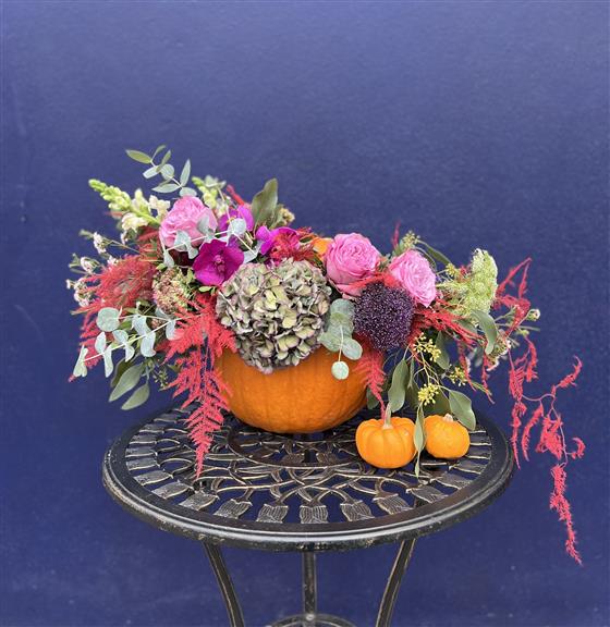 Add a touch of elegance to your fall decor with our Blushing Harvest Pumpkin Arrangement. Designed in a real pumpkin, this lush display features soft pink roses, vibrant orchids, hydrangeas, and a mix of seasonal textures and foliage. A beautiful blend of bold and delicate hues, it’s perfect for autumn gatherings, gifts, or simply brightening up your space with something truly unique.