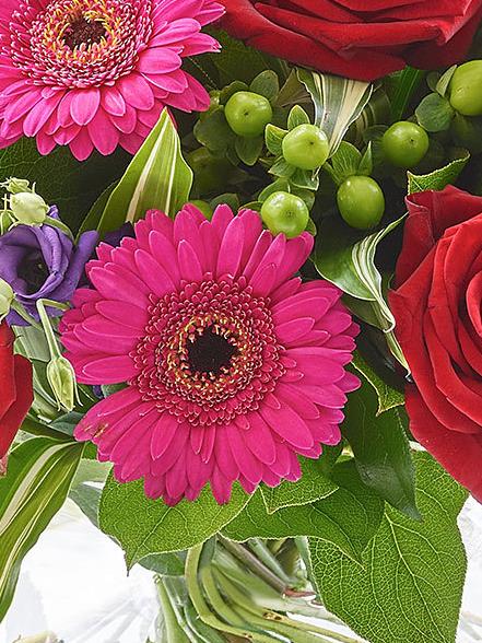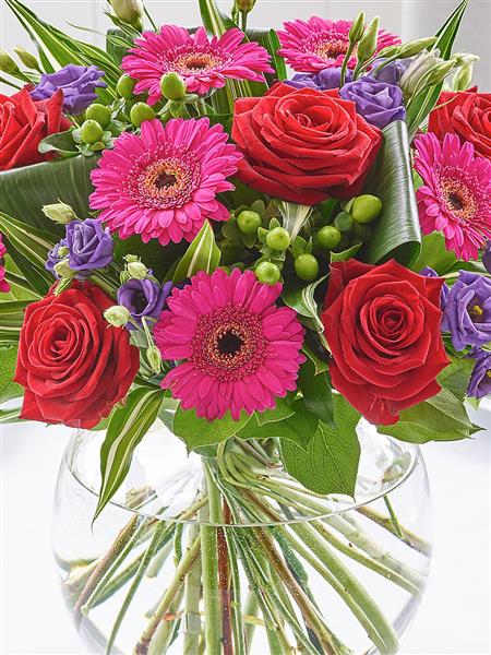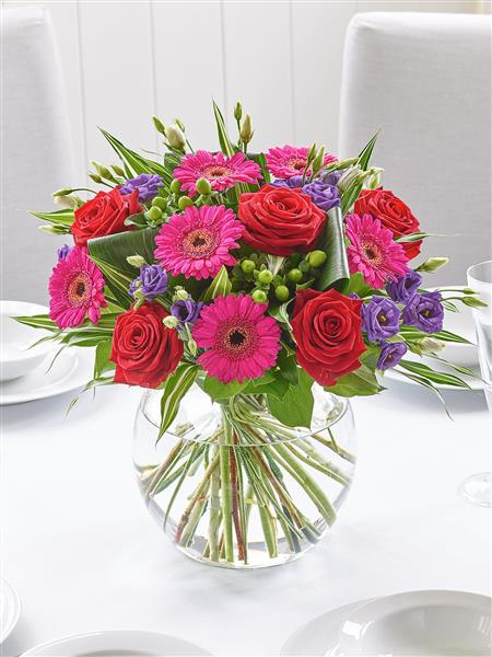 Featuring cerise germini, green hypericum, blue lisianthus, cerise large headed roses and red large headed roses with folded aspidistra leaves, variegated dracaena and salal presented in a large globe glass vase.