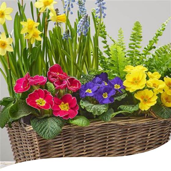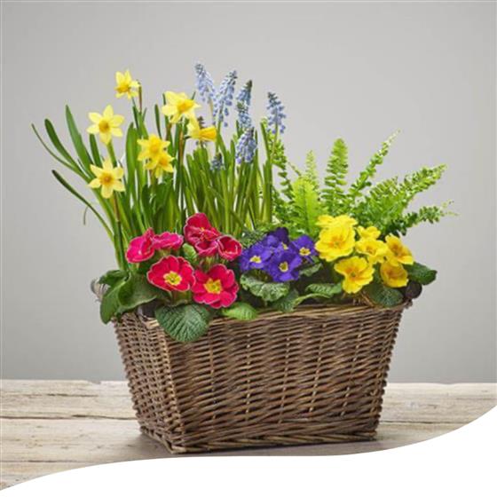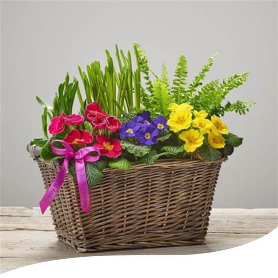 Experience the best of South London's floral artistry with our meticulously crafted Bold Brights Planted Basket. Comprising stunning Blue, Cerise, and Yellow Primrose Plants, complemented by Blue Muscari, Yellow Narcissus and a Boston Fern, all arranged in a beautiful willow woven basket. Please note that the basket may vary; however, we ensure that your arrangement will be just as beautiful.