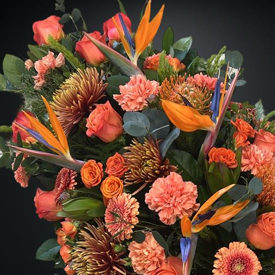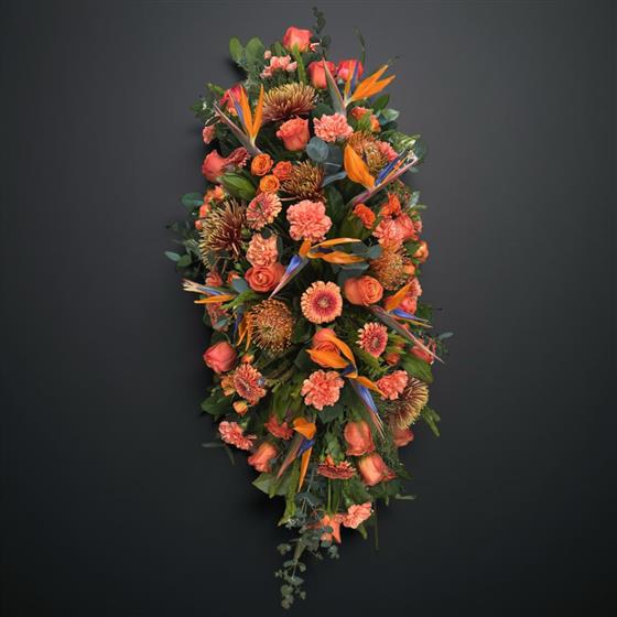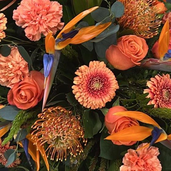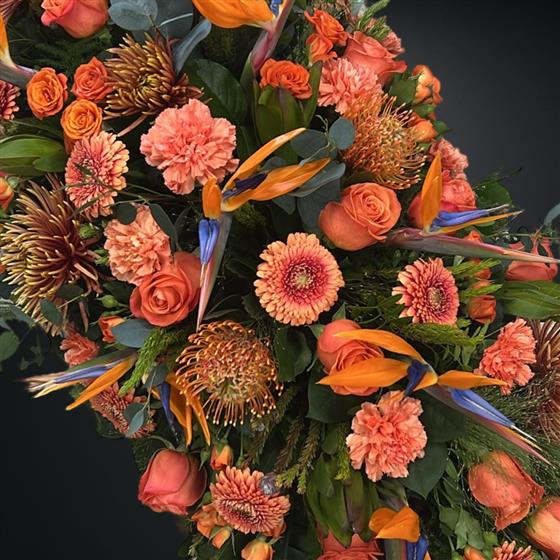 A beautiful bright orange coffin spray using the best flowers. Strelitzia’s, Carnations, Roses, Leucospurnum Pincushions, Spray Roses and Saffina Blooms.