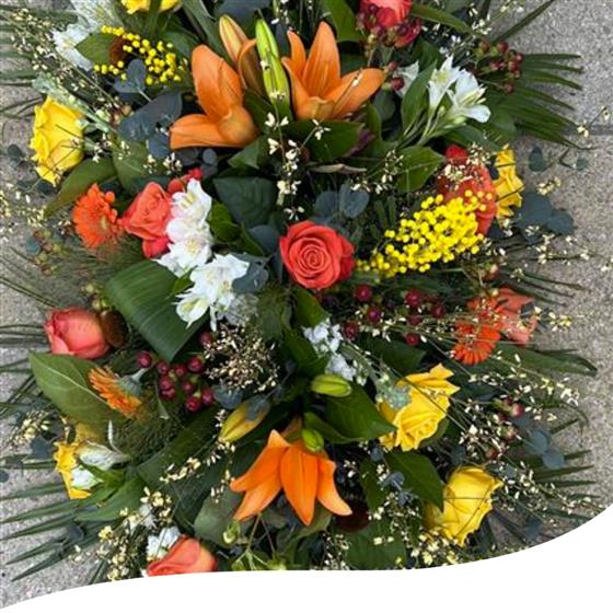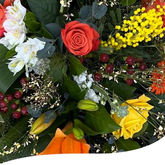 Using a mix of bright seasonal flowers we could include Yellow and Orange Roses, Orange Lily’s, Mimosa, Ginister, Alstro, Antirinums, Soli and a nice selection of mixed foliage.