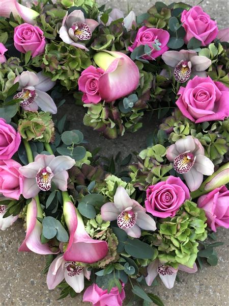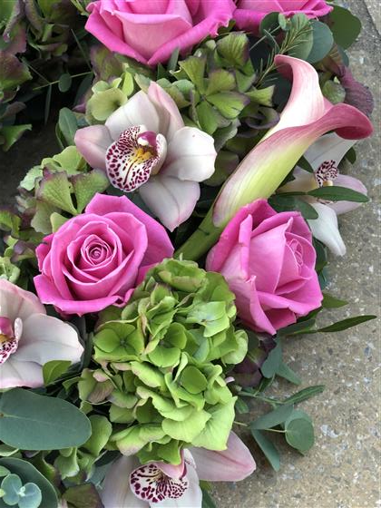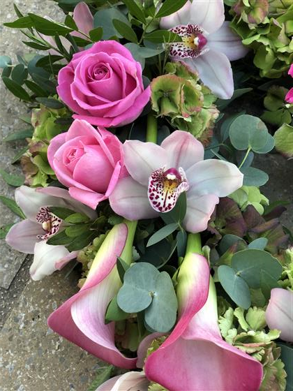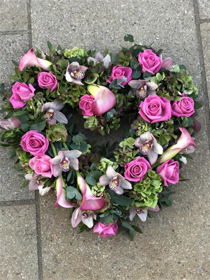 A bright Pink open Heart Tribute with Calla Lily’s, Cymbidium Orchids, Bright Cerise Roses, Green Hydrangeas and Mixed Foliage.