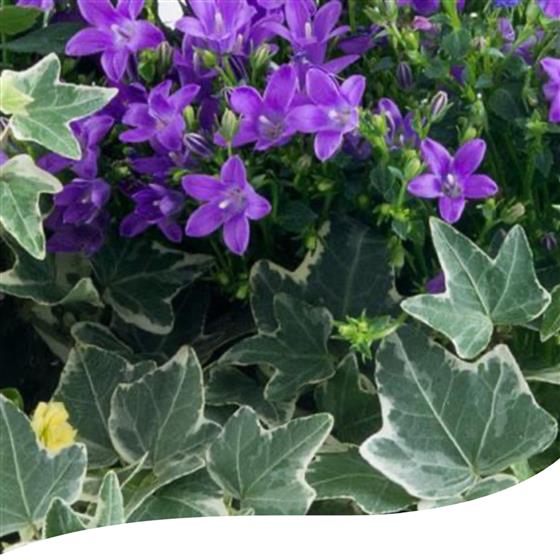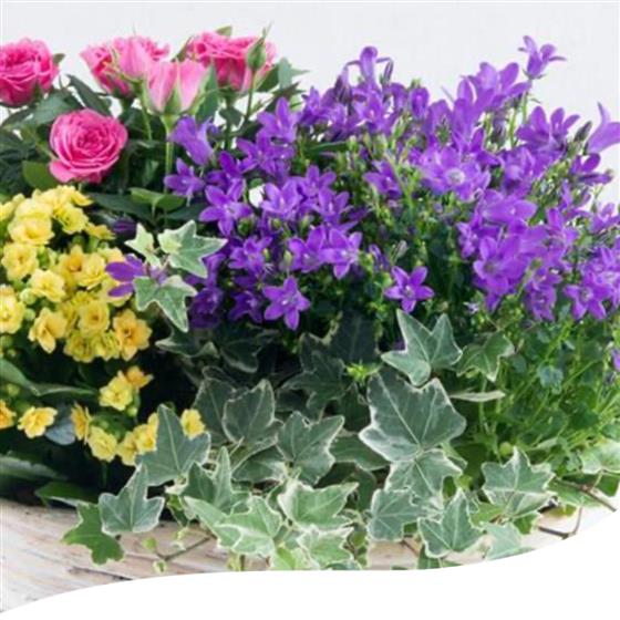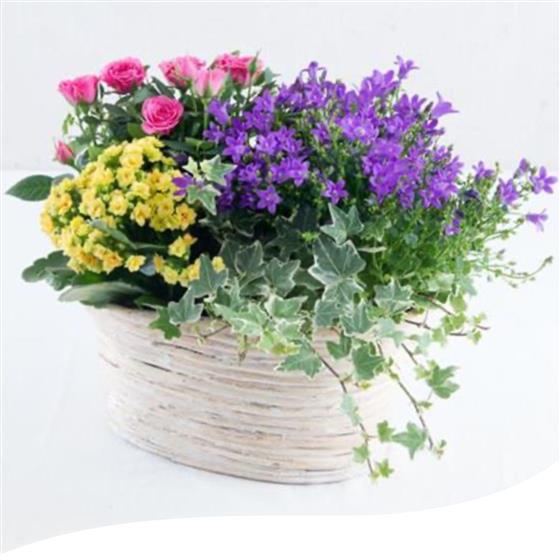 This charming planter showcases a pink Rose plant, a yellow Kalanchoe, a blue Campanula, and trailing Ivy, all thoughtfully presented in an elegant oval basket.