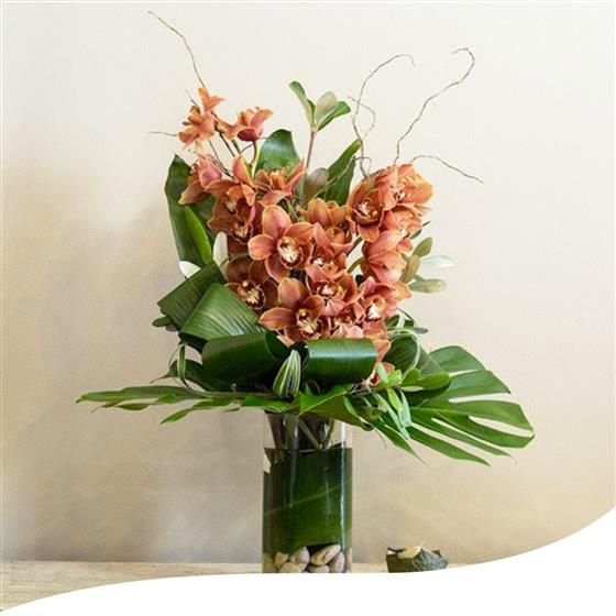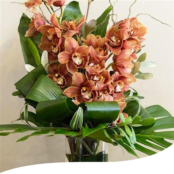 A stunning display of bronze cymbidium orchids arranged into a stylish glass vase with a selection of different foliage. Item will be fresh and expertly arranged. It's perfect for different occasions but suits reception desks, events as well as a stunning gift.