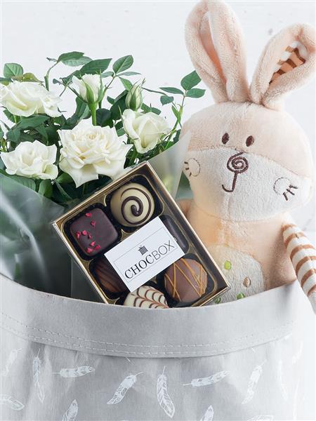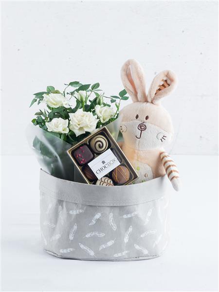 Featuring a white rose plant, a rabbit teddy and a box of chocolates presented in a canvas bag.